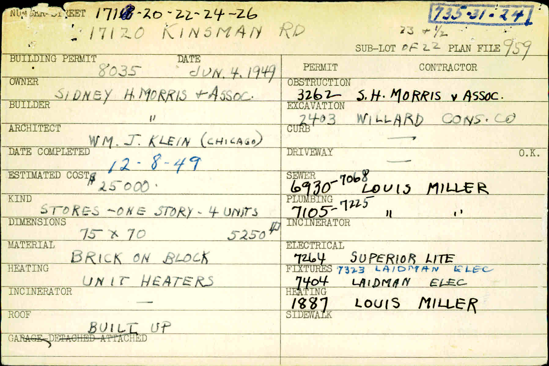 17120 - 17122 -17124 - 17126 Chagrin Boulevard Shaker Heights, OH 44120 PARCEL ID: 735-31-024 Building Permit Date: 06-04-1949 Plan File Number: 959 scanned, 1400 scanned, 1780 scanned, 5581, 7758, 7765, 7781, 7940, 7924 Microfilm Roll: Roll012, Roll016, Roll027, Roll#75, Roll#94 Neighborhood: Lomond Owner: Sidney H. Morris and Associates Builder: Sidney H. Morris and Associates Architect: Klein, William J. Estimated Cost: 25000 Date Completed: 12-08-1949 Kind: Commercial - Retail or Office Material: Brick on Block Heating: Gas Unit Heater Card Available: Yes |