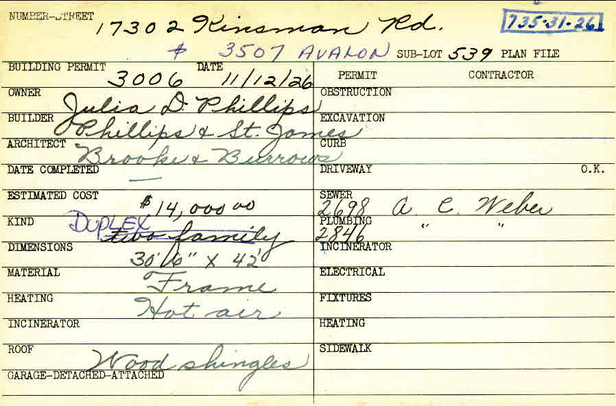 17302 Chagrin Boulevard Shaker Heights, OH 44120 PARCEL ID: 735-31-026 Building Permit Date: 11-12-1926 Plan File Number: 0 Neighborhood: Lomond Owner: Phillips, Julia D. Builder: Phillips and St. James Architect: Brooke and Burrows Estimated Cost: 14000 Kind: Duplex or Two-Family Material: Frame Heating: Hot Air Roof: Wood Shingle Card Available: yes |