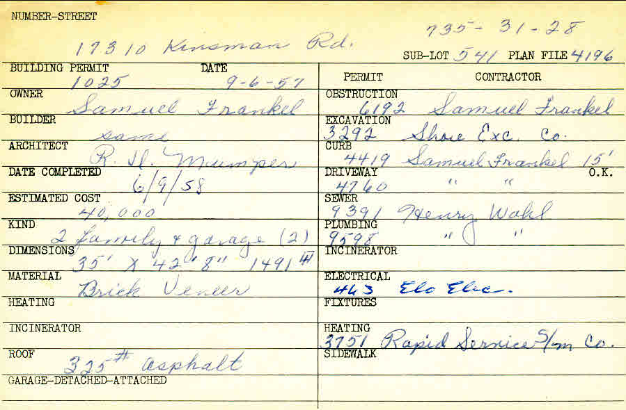 17310 Chagrin Boulevard Shaker Heights, OH 44120 PARCEL ID: 735-31-028 Building Permit Date: 09-06-1957 Plan File Number: 4196 Microfilm Roll: Roll#61 Neighborhood: Lomond Owner: Frankel, Samuel Builder: Frankel, Samuel Architect: Mumper, R. D. Estimated Cost: 40000 Date Completed: 06-09-1958 Kind: Duplex or Two-Family and Garage Material: Brick Veneer Roof: 325# Asphalt |