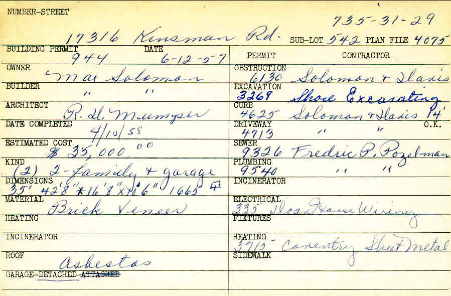 17316 Chagrin Boulevard Shaker Heights, OH 44120 PARCEL ID: 735-31-029 Building Permit Date: 06-12-1957 Plan File Number: 4075 Microfilm Roll: Roll#59 Neighborhood: Lomond Owner: Solomon, Max Builder: Solomon, Max Architect: Mumper, R. D. Estimated Cost: 35000 Date Completed: 04-10-1958 Kind: Duplex or Two-Family and Garage Material: Brick Veneer Roof: Asbestos Garage: detached |