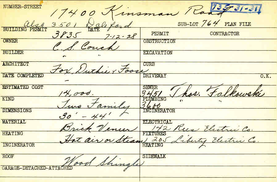 17400 Chagrin Boulevard Shaker Heights, OH 44120 PARCEL ID: 735-31-031 Building Permit Date: 07-12-1928 Plan File Number: 0 Neighborhood: Lomond Owner: Couch, C. S. Builder: Couch, C. S. Architect: Fox, Duthie and Foose Estimated Cost: 14000 Kind: Duplex or Two-Family Material: Brick Veneer Heating: Hot Air Roof: Wood Shingle Card Available: yes |