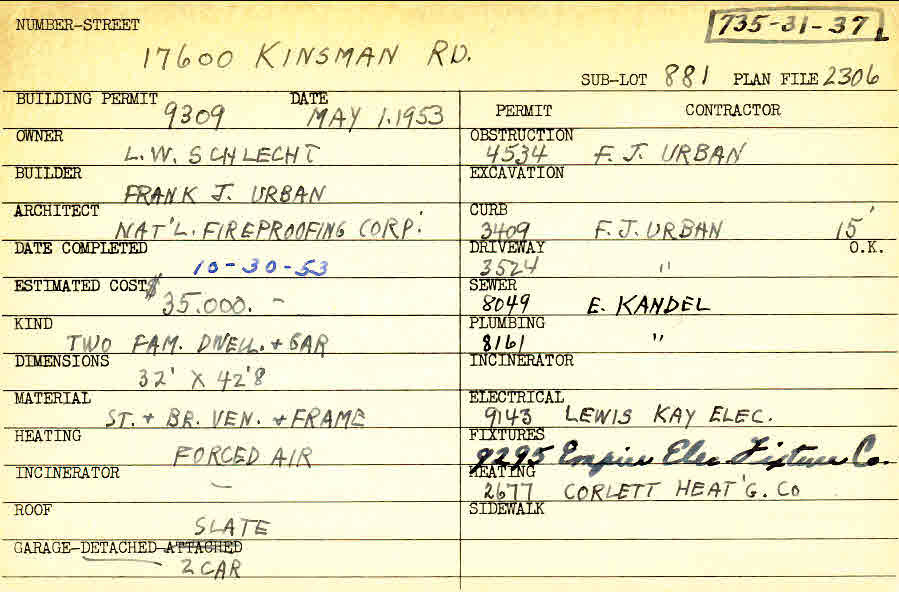 17600 Chagrin Boulevard Shaker Heights, OH 44120 PARCEL ID: 735-31-037 Building Permit Date: 05-01-1953 Plan File Number: 2306 Microfilm Roll: Roll#34 Neighborhood: Lomond Owner: Schlecht, L. W. Builder: Urban, Frank J. Architect: National Fireproofing Corporation Estimated Cost: 35000 Date Completed: 10-30-1953 Kind: Duplex or Two-Family and Garage Material: Stone and Brick Veneer and Frame Heating: Forced Air Roof: Slate Garage: detached 2 car |