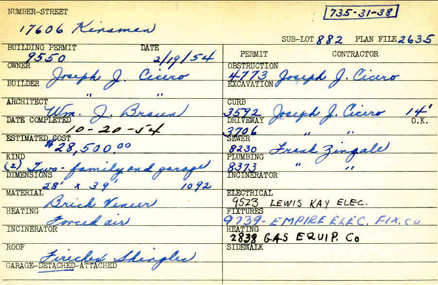 17606 Chagrin Boulevard Shaker Heights, OH 44120 PARCEL ID: 735-31-038 Building Permit Date: 02-19-1954 Plan File Number: 2635 Microfilm Roll: Roll #37 Neighborhood: Lomond Owner: Cicero, Joseph J. Builder: Cicero, Joseph J. Architect: Braun, William J. Estimated Cost: 28500 Date Completed: 10-20-1954 Kind: Duplex or Two-Family and Garage Material: Brick Veneer Heating: Forced Air Roof: Shingles Garage: detached |