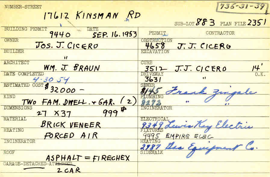 17612 Chagrin Boulevard Shaker Heights, OH 44120 PARCEL ID: 735-31-039 Building Permit Date: 09-16-1953 Plan File Number: 2351 Microfilm Roll: Roll#34 Neighborhood: Lomond Owner: Cicero, Joseph J. Builder: Cicero, Joseph J. Architect: Braun, William J. Estimated Cost: 32000 Date Completed: 04-30-1954 Kind: Duplex or Two-Family and Garage Material: Brick Veneer Heating: Forced Air Roof: Asphalt Garage: detached 2 car |
