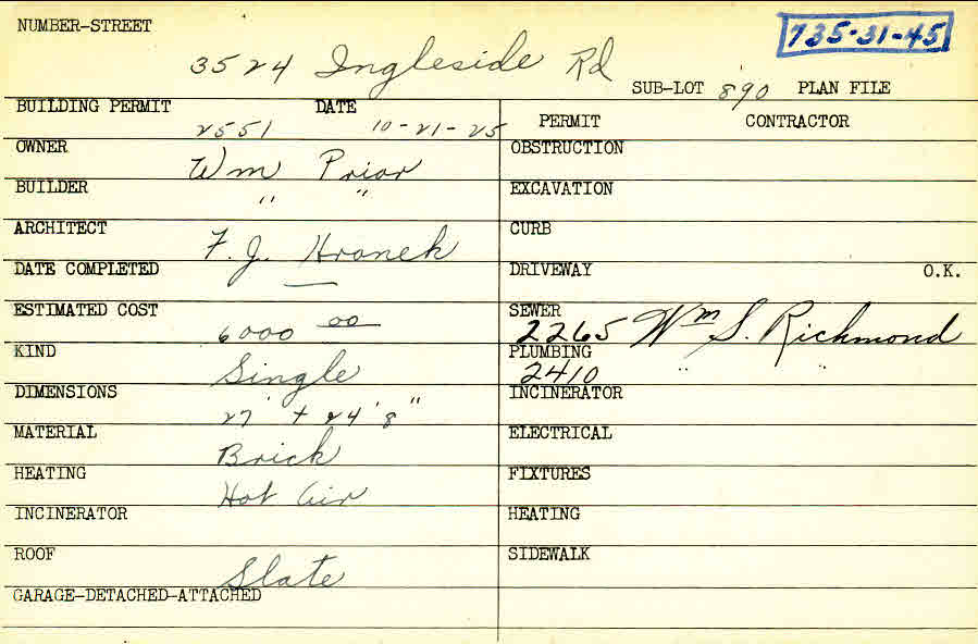 3524 Ingleside Road Shaker Heights, OH 44122 PARCEL ID: 735-31-045 Building Permit Date: 10-21-1925 Plan File Number: 0 Neighborhood: Lomond Owner: Prior, William Builder: Prior, William Architect: Hranek, F. J. Estimated Cost: 6000 Kind: Single, Single Residence or Dwelling Material: Brick Heating: Hot Air Roof: Slate Card Available: yes |