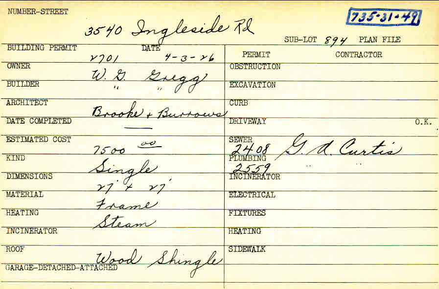 3540 Ingleside Road Shaker Heights, OH 44122 PARCEL ID: 735-31-049 Building Permit Date: 04-03-1926 Plan File Number: 0 Neighborhood: Lomond Owner: Gregg, W. G. Builder: Gregg, W. G. Architect: Brooke and Burrows Estimated Cost: 7500 Kind: Single, Single Residence or Dwelling Material: Frame Heating: Steam Roof: Wood Shingle Card Available: yes |