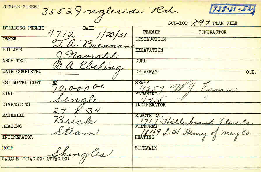 3552 Ingleside Road Shaker Heights, OH 44122 PARCEL ID: 735-31-052 Building Permit Date: 01-20-1931 Plan File Number: 0 Neighborhood: Lomond Owner: Brennan, T. A. Builder: Navratil, J. Architect: Ebeling, G. A. Estimated Cost: 10000 Kind: Single, Single Residence or Dwelling Material: Brick Heating: Steam Roof: Shingles Card Available: yes |