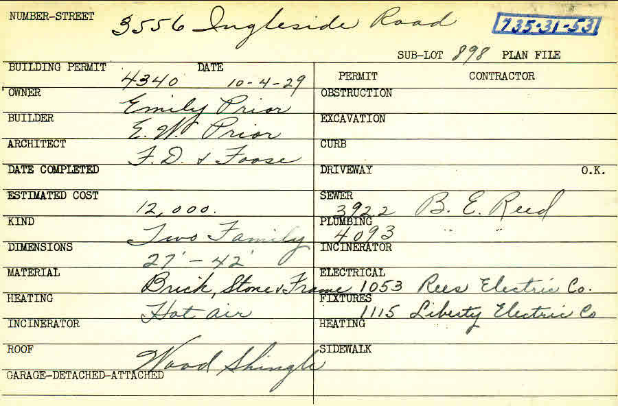 3556 Ingleside Road Shaker Heights, OH 44122 PARCEL ID: 735-31-053 Building Permit Date: 10-04-1929 Plan File Number: 0 Neighborhood: Lomond Owner: Prior, Emily Builder: Prior, E. W. Architect: Fox, Duthie and Foose Estimated Cost: 12000 Kind: Duplex or Two-Family Material: Brick, Stone and Frame Heating: Hot Air Roof: Wood Shingle Card Available: yes |