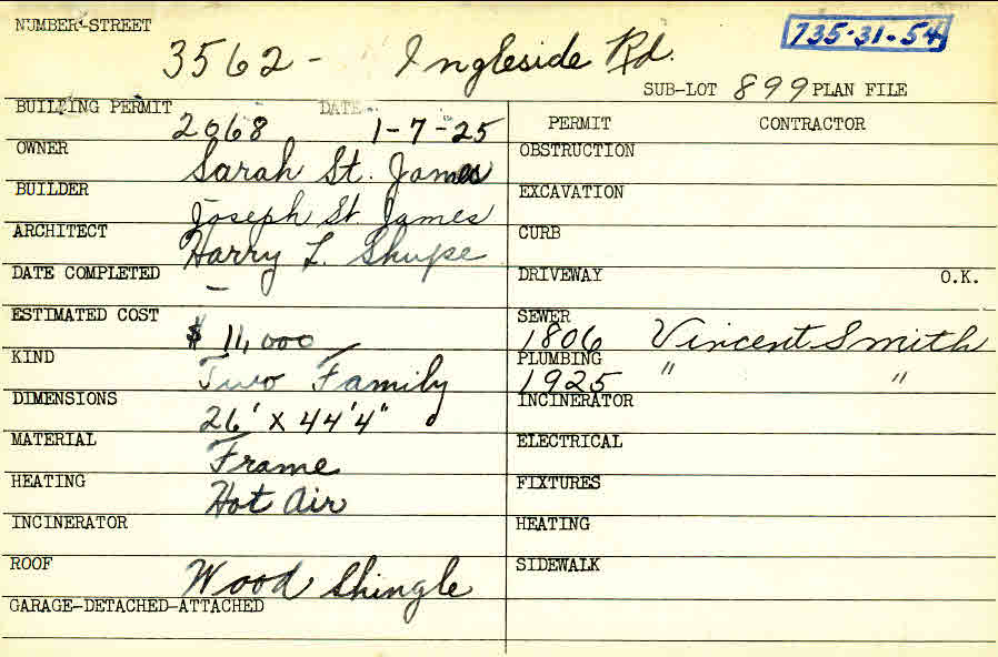 3562 Ingleside Road Shaker Heights, OH 44122 PARCEL ID: 735-31-054 Building Permit Date: 01-07-1925 Plan File Number: 6539 Microfilm Roll: Roll#86 Neighborhood: Lomond Owner: St. James, Sarah Builder: St. James, Joseph Architect: Shupe, Harry L. Estimated Cost: 11000 Kind: Duplex or Two-Family Material: Frame Heating: Hot Air Roof: Wood Shingle |