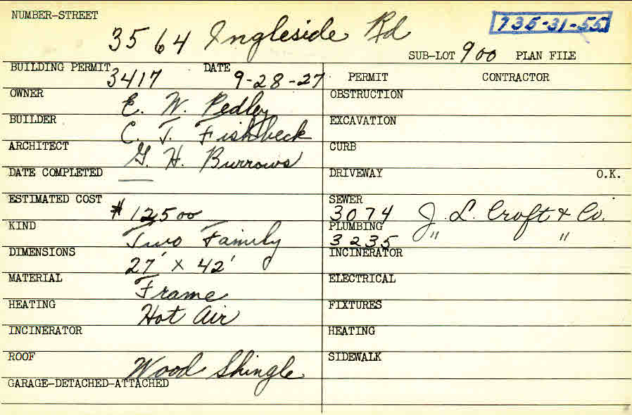 3564 Ingleside Road Shaker Heights, OH 44122 PARCEL ID: 735-31-055 Building Permit Date: 09-28-1927 Plan File Number: 6819 Microfilm Roll: Roll#88 Neighborhood: Lomond Owner: Pedley, E. W. Builder: Fishbeck, C. T. Architect: Burrows, G. H. Estimated Cost: 12500 Kind: Duplex or Two-Family Material: Frame Heating: Hot Air Roof: Wood Shingle |
