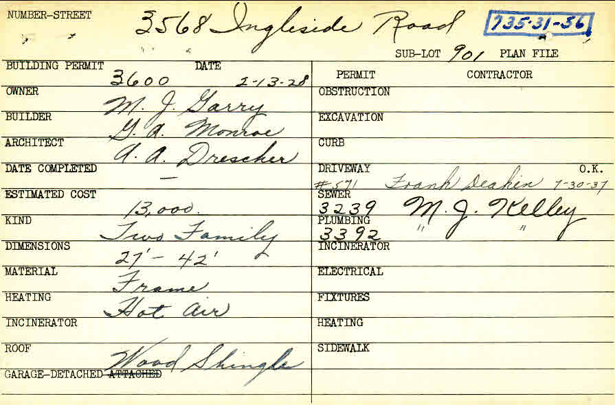 3568 Ingleside Road Shaker Heights, OH 44122 PARCEL ID: 735-31-056 Building Permit Date: 02-13-1928 Plan File Number: 0 Neighborhood: Lomond Owner: Garry, M. J. Builder: Monroe, G. A. Architect: Drescher, A. A. Estimated Cost: 13000 Kind: Duplex or Two-Family Material: Frame Heating: Hot Air Roof: Wood Shingle Garage: detached Card Available: yes |