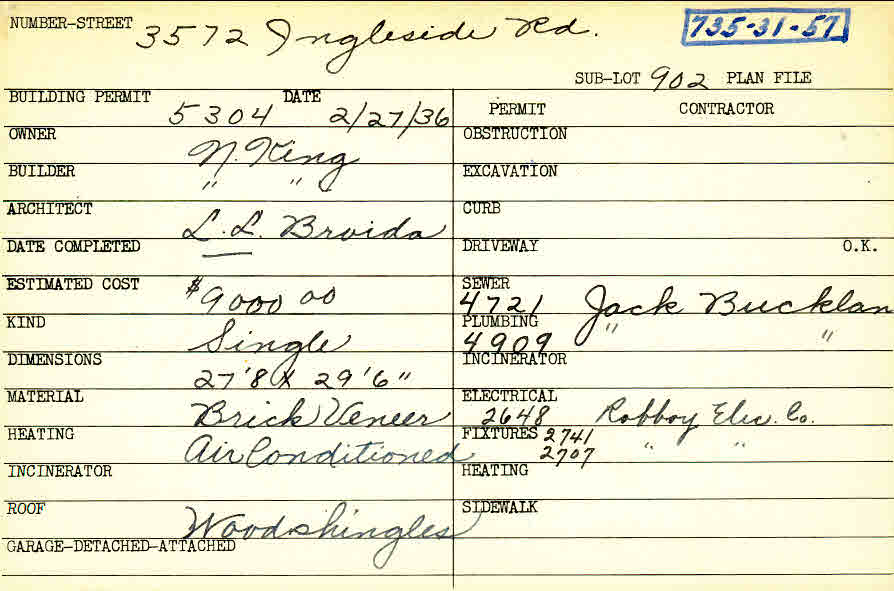 3572 Ingleside Road Shaker Heights, OH 44122 PARCEL ID: 735-31-057 Building Permit Date: 02-27-1936 Plan File Number: 0 Neighborhood: Lomond Owner: King, N. Builder: King, N. Architect: Broida, L. L. Estimated Cost: 9000 Kind: Single, Single Residence or Dwelling Material: Brick Veneer Heating: Air Conditioned Roof: Wood Shingle Card Available: yes |