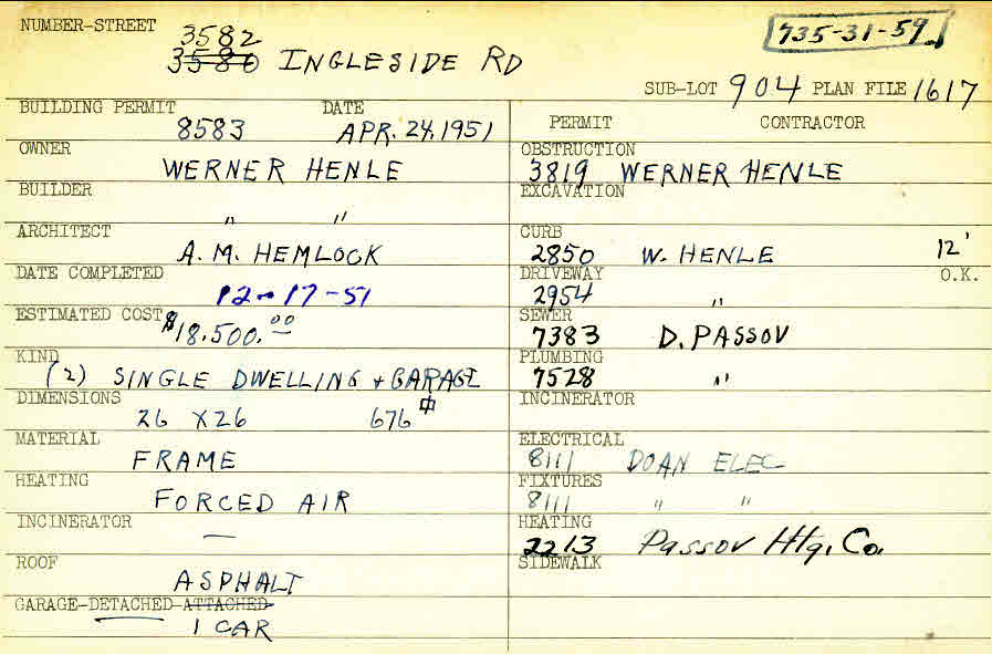 3582 Ingleside Road Shaker Heights, OH 44122 PARCEL ID: 735-31-059 Building Permit Date: 04-24-1951 Plan File Number: 1617 all scanned Microfilm Roll: Roll025 Neighborhood: Lomond Owner: Henle, Werner Builder: Henle, Werner Architect: Hemlock, A. M. Estimated Cost: 18500 Date Completed: 12-17-1951 Kind: Single Dwelling and Garage (2) Material: Frame Heating: Forced Air Roof: Asphalt Garage: detached |
