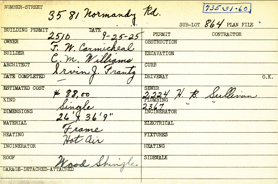 3581 Normandy Road Shaker Heights, OH 44120 PARCEL ID: 735-31-060 Building Permit Date: 09-25-1925 Plan File Number: 4338 all scanned Microfilm Roll: Roll062 Neighborhood: Lomond Owner: Carmicheal, F. W. Builder: Williams, C. M. Architect: Frantz, Irvin J. Estimated Cost: 8800 Kind: Single, Single Residence or Dwelling Material: Frame Heating: Hot Air Roof: Wood Shingle |