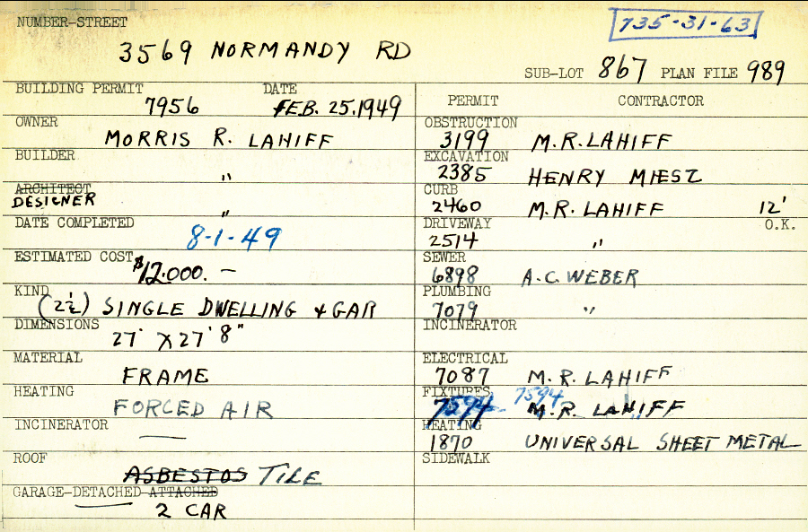 3569 Normandy Road Shaker Heights, OH 44120 PARCEL ID: 735-31-063 Building Permit Date: 02-25-1949 Plan File Number: 989 all scanned Microfilm Roll: Roll012 Neighborhood: Lomond Owner: Lahiff, Morris R. Builder: Lahiff, Morris R. Architect: Lahiff, Morris R. Estimated Cost: 12000 Date Completed: 08-01-1949 Kind: Single 2-1/2 Material: Frame Heating: Forced Air Roof: Tile Garage: detached 2 car Blueprints: online, see link above |