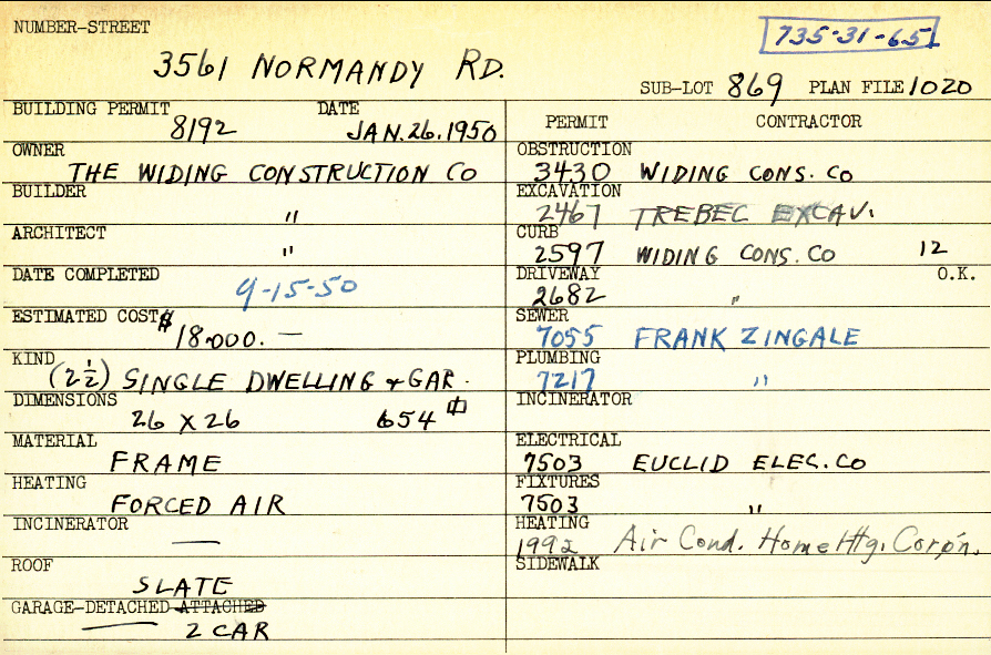 3561 Normandy Road Shaker Heights, OH 44120 PARCEL ID: 735-31-065 Building Permit Date: 01-26-1950 Plan File Number: 1020 scanned, 12797 Microfilm Roll: Roll013, NewRoll#18 Neighborhood: Lomond Owner: The Widing Construction Company Builder: The Widing Construction Company Architect: The Widing Construction Company Estimated Cost: 18000 Date Completed: 09-15-1950 Kind: Single 2-1/2 Material: Frame Heating: Forced Air Roof: Slate Garage: detached 2 car |