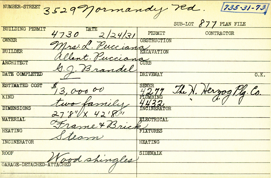3529 Normandy Road Shaker Heights, OH 44120 PARCEL ID: 735-31-073 Building Permit Date: 02-24-1931 Plan File Number: 0 Neighborhood: Lomond Owner: Pucciana, Mrs. L. Builder: Pucciana, Allent. Architect: Brandel, G. J. Estimated Cost: 13000 Kind: Duplex or Two-Family Material: Frame and Brick Heating: Steam Roof: Wood Shingle |
