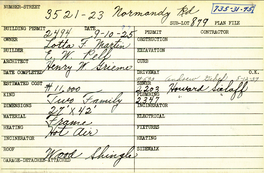 3521 Normandy Road Shaker Heights, OH 44120 PARCEL ID: 735-31-075 Building Permit Date: 09-10-1925 Plan File Number: 0 Neighborhood: Lomond Owner: Martin, Lotta F. Builder: Pell, E. W. Architect: Grieme, Henry W. Estimated Cost: 11000 Kind: Duplex or Two-Family Material: Frame Heating: Hot Air Roof: Wood Shingle |