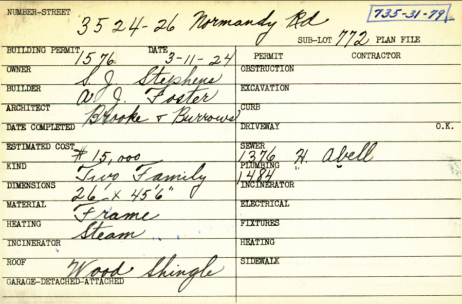 3524 Normandy Road Shaker Heights, OH 44120 PARCEL ID: 735-31-079 Building Permit Date: 03-11-1924 Plan File Number: 7157 Microfilm Roll: Roll#91 Neighborhood: Lomond Owner: Stephens, S. J. Builder: Foster, A. J. Architect: Brooke and Burrows Estimated Cost: 15000 Kind: Duplex or Two-Family Material: Frame Heating: Steam Roof: Wood Shingle |