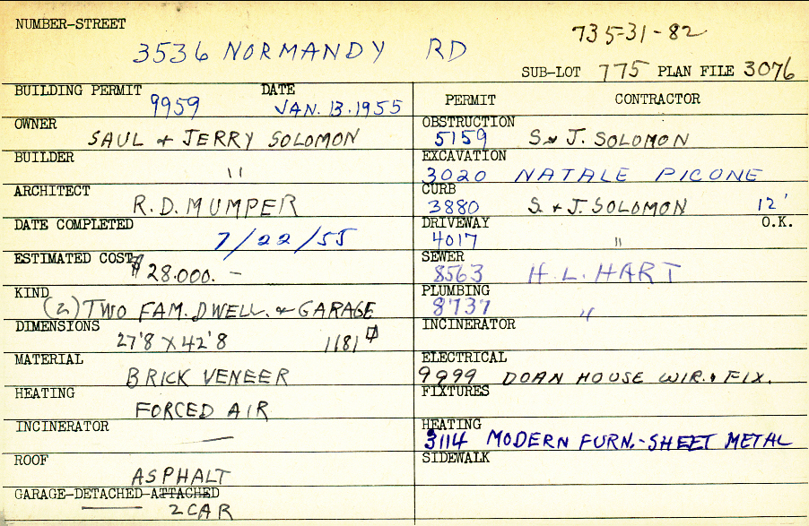 3536 Normandy Road Shaker Heights, OH 44120 PARCEL ID: 735-31-082 Building Permit Date: 01-13-1955 Plan File Number: 3076 Microfilm Roll: Roll#43 Neighborhood: Lomond Owner: Solomon, Saul and Jerry Builder: Solomon, Saul and Jerry Architect: Mumper, R. D. Estimated Cost: 28000 Date Completed: 07-22-1955 Kind: Duplex or Two-Family and Garage Material: Brick Veneer Heating: Forced Air Roof: Asphalt Garage: detached 2 car |