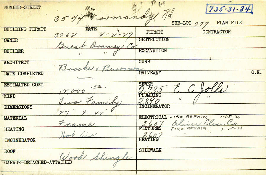3544 Normandy Road Shaker Heights, OH 44120 PARCEL ID: 735-31-084 Building Permit Date: 02-02-1927 Plan File Number: 0 Neighborhood: Lomond Owner: Guest Dromey Company Builder: Guest Dromey Company Architect: Brooke and Burrows Estimated Cost: 12000 Kind: Duplex or Two-Family Material: Frame Heating: Hot Air Roof: Wood Shingle |