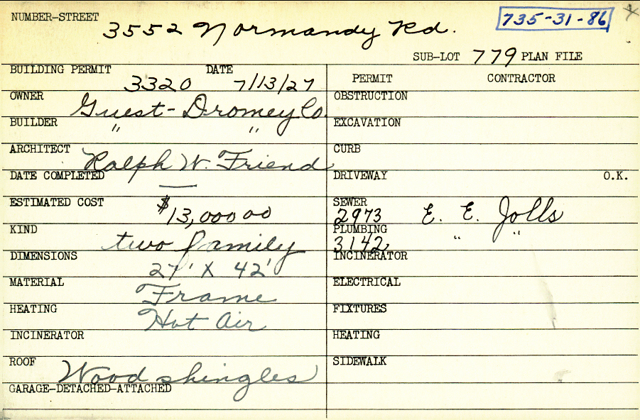 3552 Normandy Road Shaker Heights, OH 44120 PARCEL ID: 735-31-086 Building Permit Date: 07-13-1927 Plan File Number: 0 Neighborhood: Lomond Owner: Guest-Dromey Company Builder: Guest-Dromey Company Architect: Friend, Ralph W. Estimated Cost: 13000 Kind: Duplex or Two-Family Material: Frame Heating: Hot Air Roof: Wood Shingle Card Available: yes |