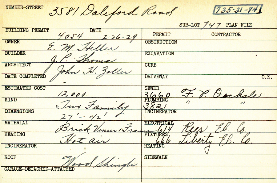 3581 Daleford Road Shaker Heights, OH 44120 PARCEL ID: 735-31-094 Building Permit Date: 02-26-1929 Plan File Number: 0 Neighborhood: Lomond Owner: Heller, E. M. Builder: Thoma, J. P. Architect: Zoller, John H. Estimated Cost: 12000 Kind: Duplex or Two-Family Material: Brick Veneer And Frame Heating: Hot Air Roof: Wood Shingle |