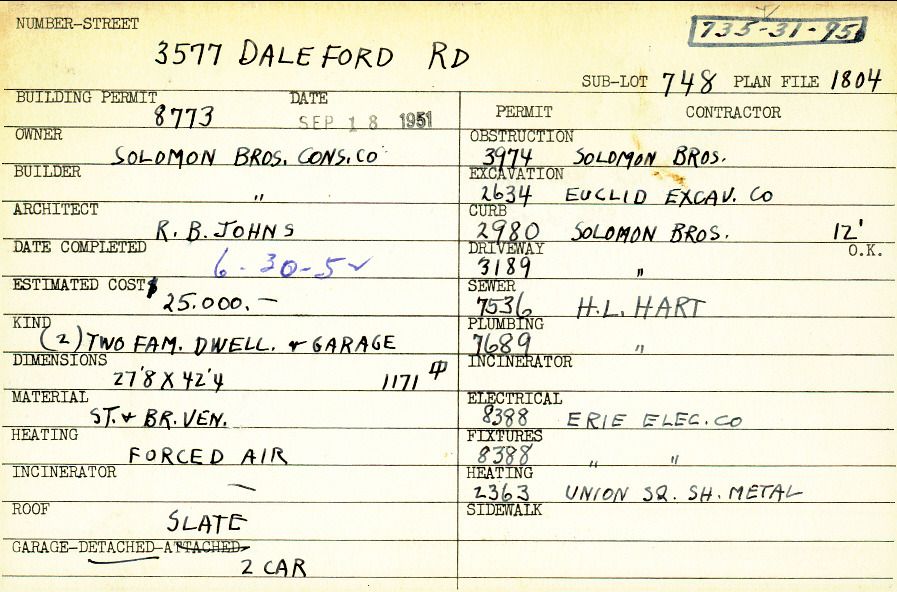 3577 Daleford Road Shaker Heights, OH 44120 PARCEL ID: 735-31-095 Building Permit Date: 09-18-1951 Plan File Number: 1804 all scanned Microfilm Roll: Roll027 Neighborhood: Lomond Owner: Solomon Brothers Construction Company Builder: Solomon Brothers Construction Company Architect: Johns, R. B. Estimated Cost: 25000 Date Completed: 06-30-1952 Kind: Duplex or Two-Family and Garage Material: Stone and Brick Veneer Heating: Forced Air Roof: Slate Garage: detached 2 car |