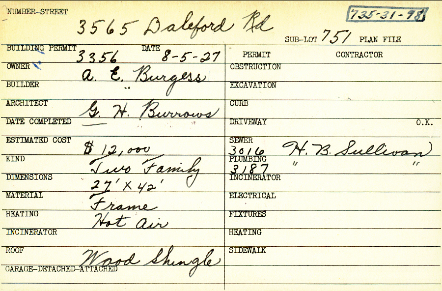 3565 Daleford Road Shaker Heights, OH 44120 PARCEL ID: 735-31-098 Building Permit Date: 08-05-1927 Plan File Number: 948 all scanned Microfilm Roll: Roll012 Neighborhood: Lomond Owner: Burgess, A. E. Builder: Burgess, A. E. Architect: Burrows, G. H. Estimated Cost: 12000 Kind: Duplex or Two-Family Material: Frame Heating: Hot Air Roof: Wood Shingle |