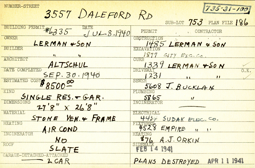 3557 Daleford Road Shaker Heights, OH 44120 PARCEL ID: 735-31-100 Building Permit Date: 07-08-1940 Plan File Number: 186, 10649 Microfilm Roll: NewRoll#5 Neighborhood: Lomond Owner: Lerman and Son Builder: Lerman and Son Architect: Altshuld, M. Estimated Cost: 8500 Date Completed: 09-30-1940 Kind: Single Dwelling and Garage Material: Stone Veneer and Frame Heating: Air Conditioned Roof: Slate Garage: detached 2 car |