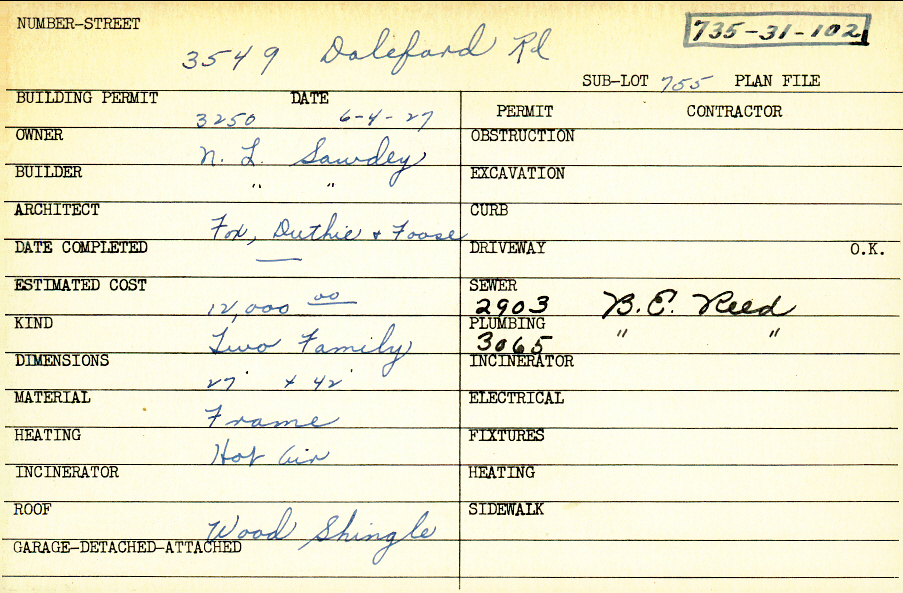 3549 Daleford Road Shaker Heights, OH 44120 PARCEL ID: 735-31-102 Building Permit Date: 06-04-1927 Plan File Number: 5044 all scanned Microfilm Roll: Roll069 Neighborhood: Lomond Owner: Sawdey, N. L. Builder: Sawdey, N. L. Architect: Fox, Duthie and Foose Estimated Cost: 12000 Kind: Duplex or Two-Family Material: Frame Heating: Hot Air Roof: Wood Shingle Blueprints: online, see link above |