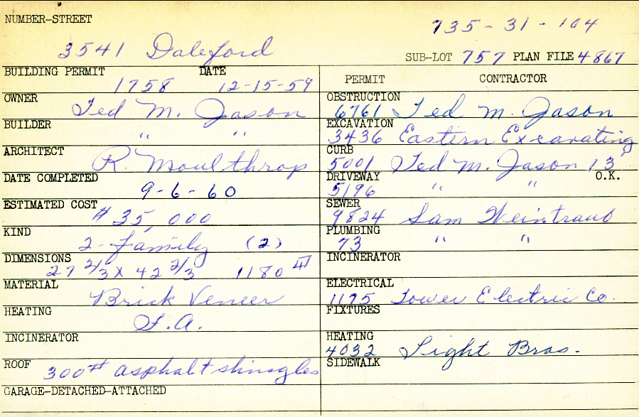 3541 Daleford Road Shaker Heights, OH 44120 PARCEL ID: 735-31-104 Building Permit Date: 12-15-1959 Plan File Number: 4867 Microfilm Roll: Roll#66 Neighborhood: Lomond Owner: Jason, Ted M. Builder: Jason, Ted M. Architect: Moulthrop, R. Estimated Cost: 35000 Date Completed: 09-06-1960 Kind: Duplex or Two-Family Material: Brick Veneer Heating: Forced Air Roof: 300# Min Asphalt |