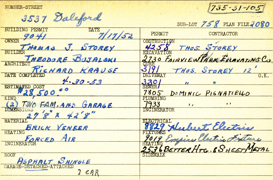 3537 Daleford Road Shaker Heights, OH 44120 PARCEL ID: 735-31-105 Building Permit Date: 07-17-1952 Plan File Number: 2080 Microfilm Roll: Roll#32 Neighborhood: Lomond Owner: Storey, Thomas J. Builder: Bojalski, Theodore Architect: Krause, Richard Estimated Cost: 28500 Date Completed: 04-30-1953 Kind: Duplex or Two-Family and Garage Material: Brick Veneer Heating: Forced Air Roof: Asphalt Shingles Garage: detached 2 car |