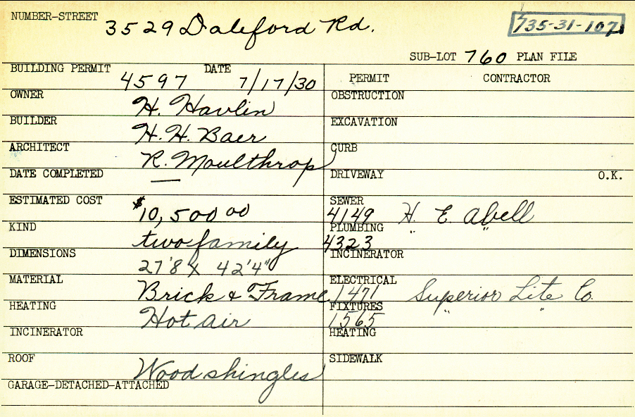 3529 Daleford Road Shaker Heights, OH 44120 PARCEL ID: 735-31-107 Building Permit Date: 07-17-1930 Plan File Number: 0 Neighborhood: Lomond Owner: Havlin, H. Builder: Baer, H. H. Architect: Moulthrop, R. Estimated Cost: 10500 Kind: Duplex or Two-Family Material: Brick and Frame Heating: Hot Air Roof: Wood Shingle |