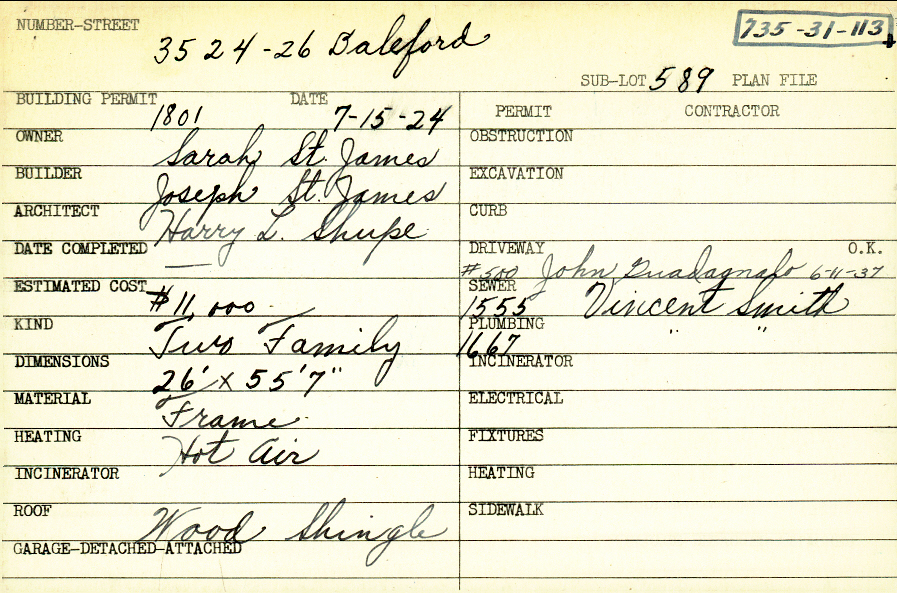 3524 Daleford Road Shaker Heights, OH 44120 PARCEL ID: 735-31-113 Building Permit Date: 07-15-1924 Plan File Number: 0 Neighborhood: Lomond Owner: St. James, Sarah Builder: St. James, Sarah Architect: Shupe, Harry L. Estimated Cost: 11000 Kind: Duplex or Two-Family Material: Frame Heating: Hot Air Roof: Wood Shingle |