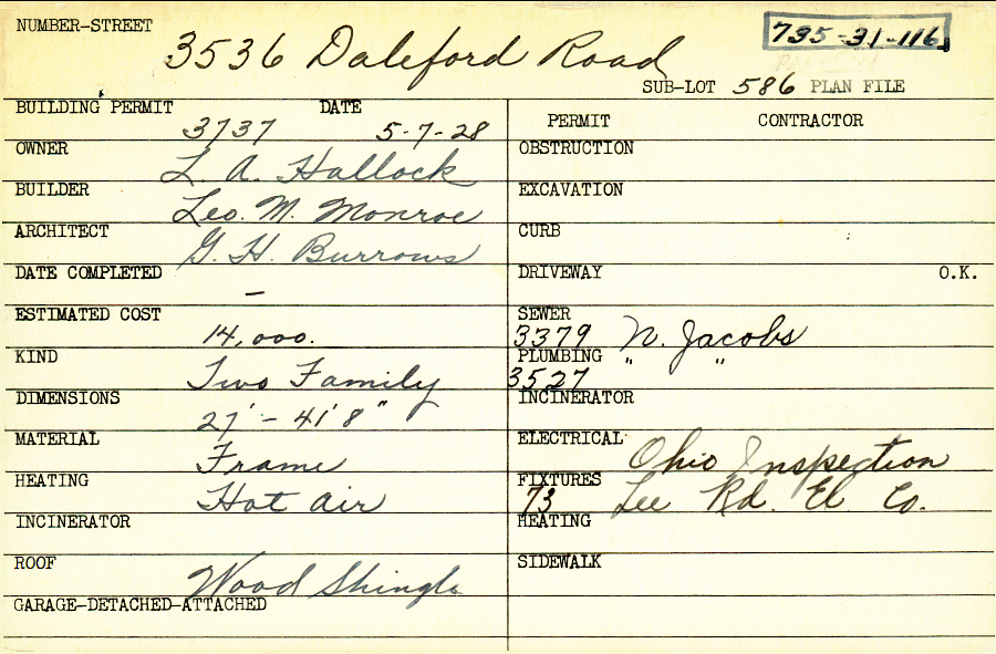 3536 Daleford Road Shaker Heights, OH 44120 PARCEL ID: 735-31-116 Building Permit Date: 05-07-1928 Plan File Number: 0 Neighborhood: Lomond Owner: Hallock, L. A. Builder: Monroe, Leo M. Architect: Burrows, George H. Estimated Cost: 14000 Kind: Duplex or Two-Family Material: Frame Heating: Hot Air Roof: Wood Shingle |