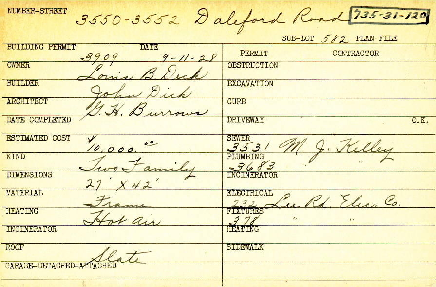 3550 Daleford Road Shaker Heights, OH 44120 PARCEL ID: 735-31-120 Building Permit Date: 09-11-1928 Plan File Number: 0 Neighborhood: Lomond Owner: Dick, Louis B. Builder: Dick, John Architect: Burrows, G. H. Estimated Cost: 10000 Kind: Duplex or Two-Family Material: Frame Heating: Hot Air Roof: Slate |