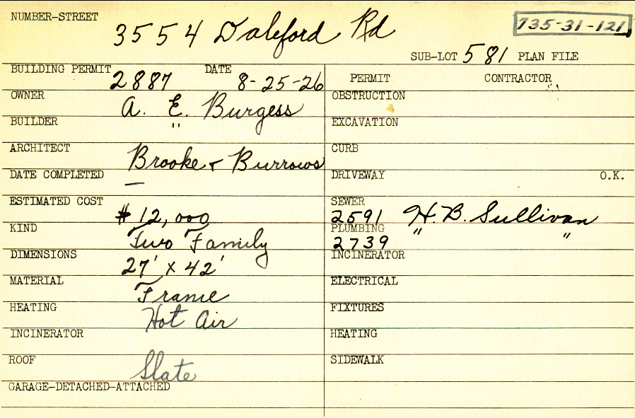 3554 Daleford Road Shaker Heights, OH 44120 PARCEL ID: 735-31-121 Building Permit Date: 08-25-1926 Plan File Number: 0 Neighborhood: Lomond Owner: Burgess, A. E. Builder: Burgess, A. E. Architect: Brooke and Burrows Estimated Cost: 12000 Kind: Duplex or Two-Family Material: Frame Heating: Hot Air Roof: Slate |