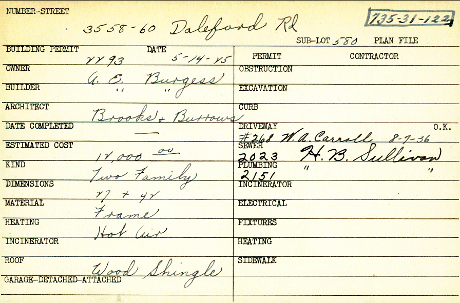 3558 Daleford Road Shaker Heights, OH 44120 PARCEL ID: 735-31-122 Building Permit Date: 05-14-1925 Plan File Number: 4490 Microfilm Roll: Roll#63 Neighborhood: Lomond Owner: Burgess, A. E. Builder: Burgess, A. E. Architect: Brooke and Burrows Estimated Cost: 12000 Kind: Duplex or Two-Family Material: Frame Heating: Hot Air Roof: Wood Shingle |
