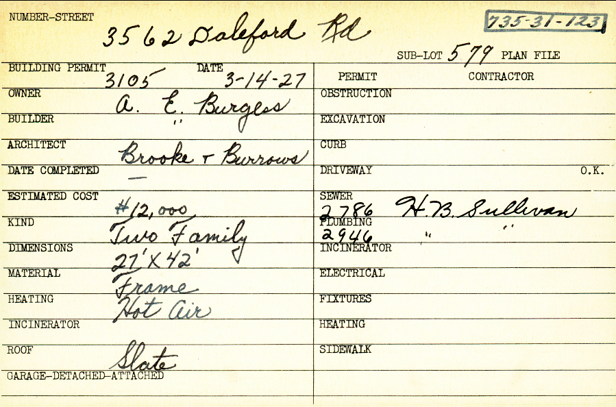 3562 Daleford Road Shaker Heights, OH 44120 PARCEL ID: 735-31-123 Building Permit Date: 03-14-1927 Plan File Number: 0 Neighborhood: Lomond Owner: Burgess, A. E. Builder: Burgess, A. E. Architect: Brooke and Burrows Estimated Cost: 12000 Kind: Duplex or Two-Family Material: Frame Heating: Hot Air Roof: Slate |