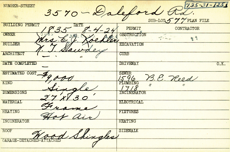3570 Daleford Road Shaker Heights, OH 44120 PARCEL ID: 735-31-125 Building Permit Date: 08-04-1924 Plan File Number: 0 Neighborhood: Lomond Owner: Koehler, Mrs. E. J. Builder: Sawdey, N. T. Architect: Sawdey, N. T. Estimated Cost: 9000 Kind: Single, Single Residence or Dwelling Material: Frame Heating: Hot Air Roof: Wood Shingle |