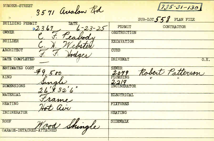 3571 Avalon Road Shaker Heights, OH 44120 PARCEL ID: 735-31-130 Building Permit Date: 06-23-1925 Plan File Number: 5231 Microfilm Roll: Roll#72 Neighborhood: Lomond Owner: Peabody, C. F. Builder: Webster, C. H. Architect: Hodges, F. F. Estimated Cost: 9500 Kind: Single, Single Residence or Dwelling Material: Frame Heating: Hot Air Roof: Wood Shingle |
