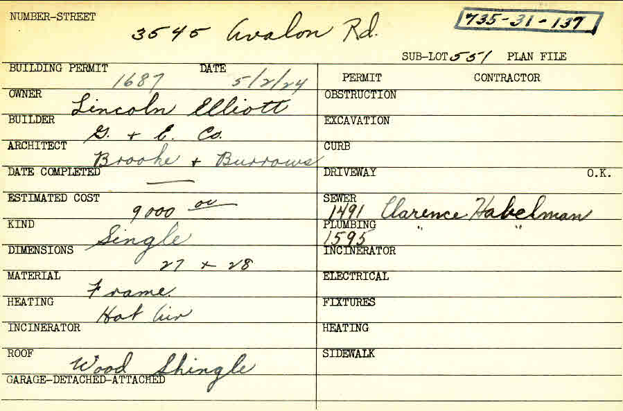 3545 Avalon Road Shaker Heights, OH 44120 PARCEL ID: 735-31-137 Building Permit Date: 05-02-1924 Plan File Number: 5931 Microfilm Roll: Roll#80 Neighborhood: Lomond Owner: Elliott, Lincoln Builder: G and E Company Architect: Brooke and Burrows Estimated Cost: 9000 Kind: Single, Single Residence or Dwelling Material: Frame Heating: Hot Air Roof: Wood Shingle |