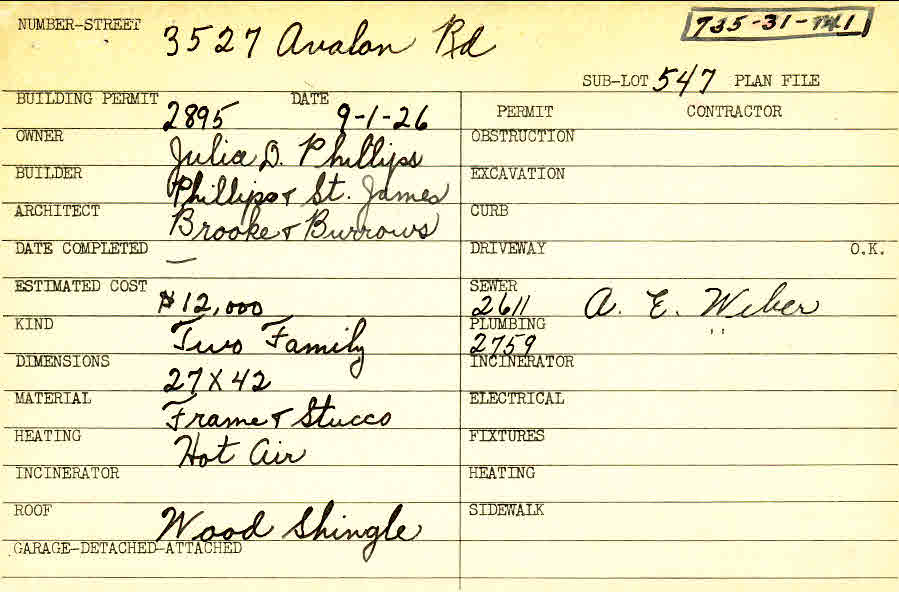 3527 Avalon Road Shaker Heights, OH 44120 PARCEL ID: 735-31-141 Building Permit Date: 09-01-1926 Plan File Number: 0 Neighborhood: Lomond Owner: Phillips, Julia D. Builder: Phillips and St. James Architect: Brooke and Burrows Estimated Cost: 12000 Kind: Duplex or Two-Family Material: Frame and Stucco Heating: Hot Air Roof: Wood Shingle Card Available: yes |