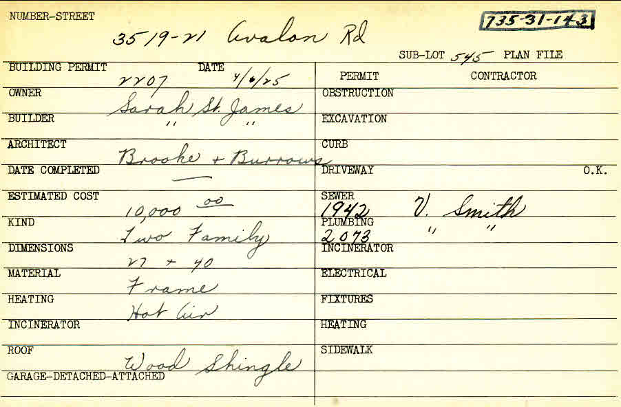 3519 Avalon Road Shaker Heights, OH 44120 PARCEL ID: 735-31-143 Building Permit Date: 04-06-1925 Plan File Number: 10550 Microfilm Roll: NewRoll#4 Neighborhood: Lomond Owner: St. James, Sarah Builder: St. James, Sarah Architect: Broooke and Burrows Estimated Cost: 10000 Kind: Duplex or Two-Family Material: Frame Heating: Hot Air Roof: Wood Shingle  |