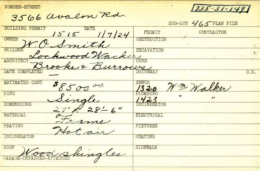 3566 Avalon Road Shaker Heights, OH 44120 PARCEL ID: 735-31-149 Building Permit Date: 01-07-1924 Plan File Number: 0 Neighborhood: Lomond Owner: Smith, W. O. Builder: Wacker, Lockwood Architect: Brooke and Burrows Estimated Cost: 8500 Kind: Single, Single Residence or Dwelling Material: Frame Heating: Hot Air Roof: Wood Shingle Card Available: yes |