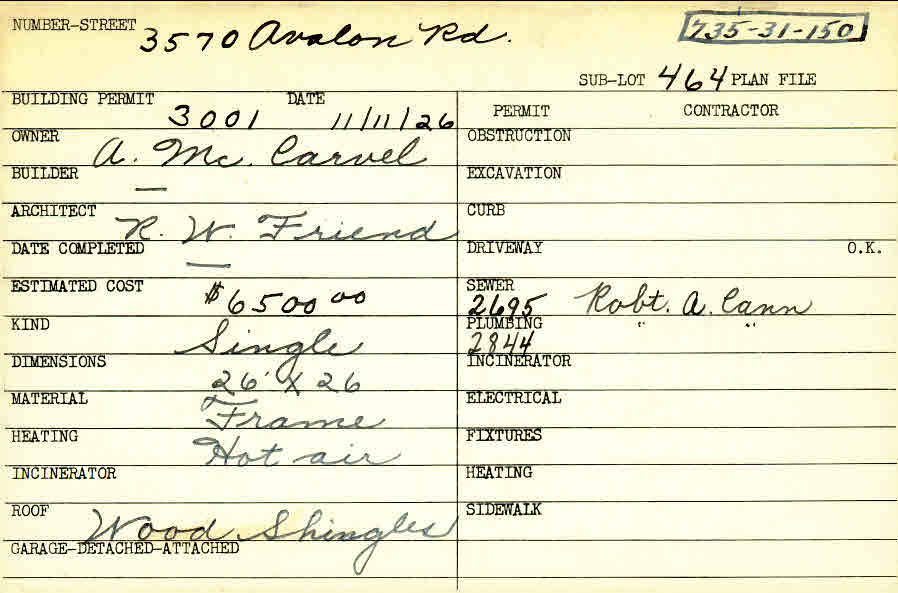 3570 Avalon Road Shaker Heights, OH 44120 PARCEL ID: 735-31-150 Building Permit Date: 11-11-1926 Plan File Number: 0 Neighborhood: Lomond Owner: McCarvel, A. Architect: Friend, R. W. Estimated Cost: 6500 Kind: Single, Single Residence or Dwelling Material: Frame Heating: Hot Air Roof: Wood Shingle Card Available: yes |
