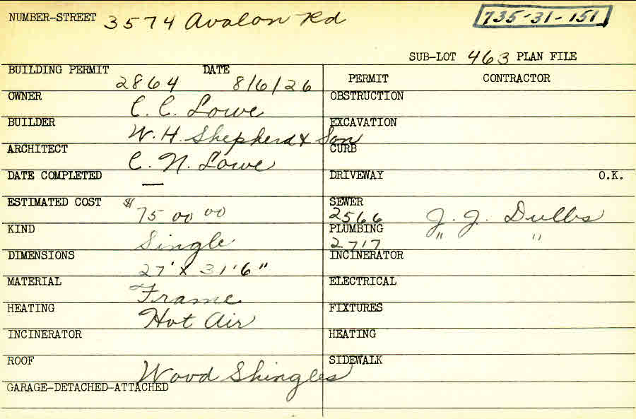 3574 Avalon Road Shaker Heights, OH 44120 PARCEL ID: 735-31-151 Building Permit Date: 08-06-1926 Plan File Number: 0 Neighborhood: Lomond Owner: Lowe, C. C. Builder: W. H. Shepherd and Son Architect: Lowe, C. N. Estimated Cost: 7500 Kind: Single, Single Residence or Dwelling Material: Frame Heating: Hot Air Roof: Wood Shingle Card Available: yes |