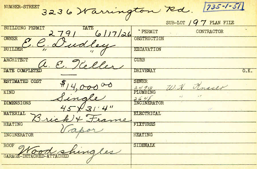 3236 Warrington Road Shaker Heights, OH 44120 PARCEL ID: 735-01-051 Building Permit Date: 06-17-1926 Plan File Number: 4074 Microfilm Roll: Roll#59 Neighborhood: Onaway Owner: Dudley, E. C. Builder: Dudley, E. C. Architect: Keller, Arthur Emil Estimated Cost: 14000 Kind: Single, Single Residence or Dwelling Material: Brick and Frame Heating: Vapor Roof: Wood Shingle |