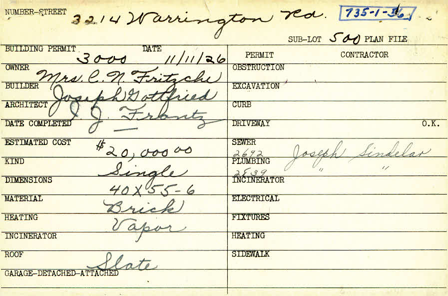 3214 Warrington Road Shaker Heights, OH 44120 PARCEL ID: 735-01-056 Building Permit Date: 11-11-1926 Plan File Number: 1339 all scanned Microfilm Roll: Roll015 Neighborhood: Onaway Owner: Fritzche, Mrs. C. N. Builder: Gottfried, Joseph Architect: Frantz, Irvin J. Estimated Cost: 20000 Kind: Single, Single Residence or Dwelling Material: Brick Heating: Vapor Roof: Slate |